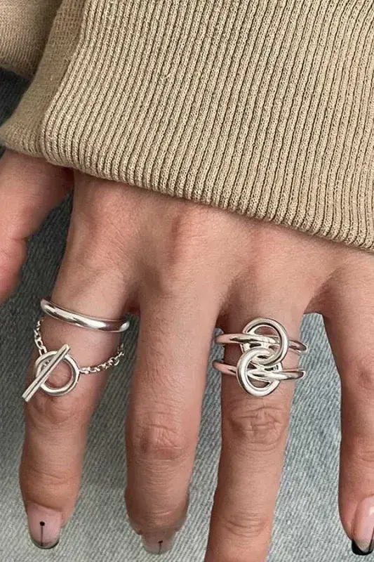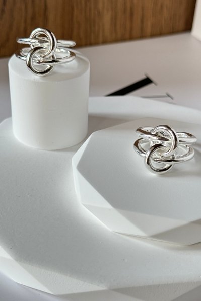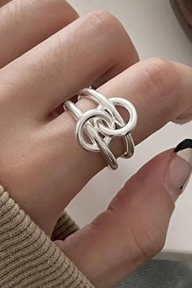 Elos polidos orbitam uma faixa prateada de corte preciso, equilibrando tensão e fluidez com a arrojosa precisão de um design sofisticado.