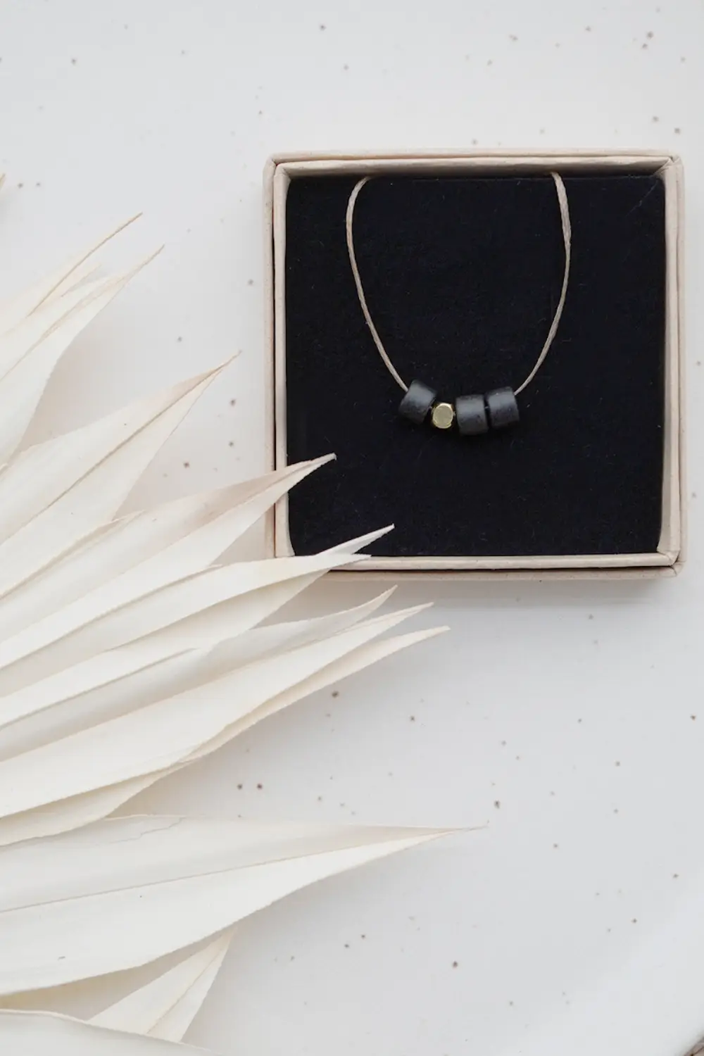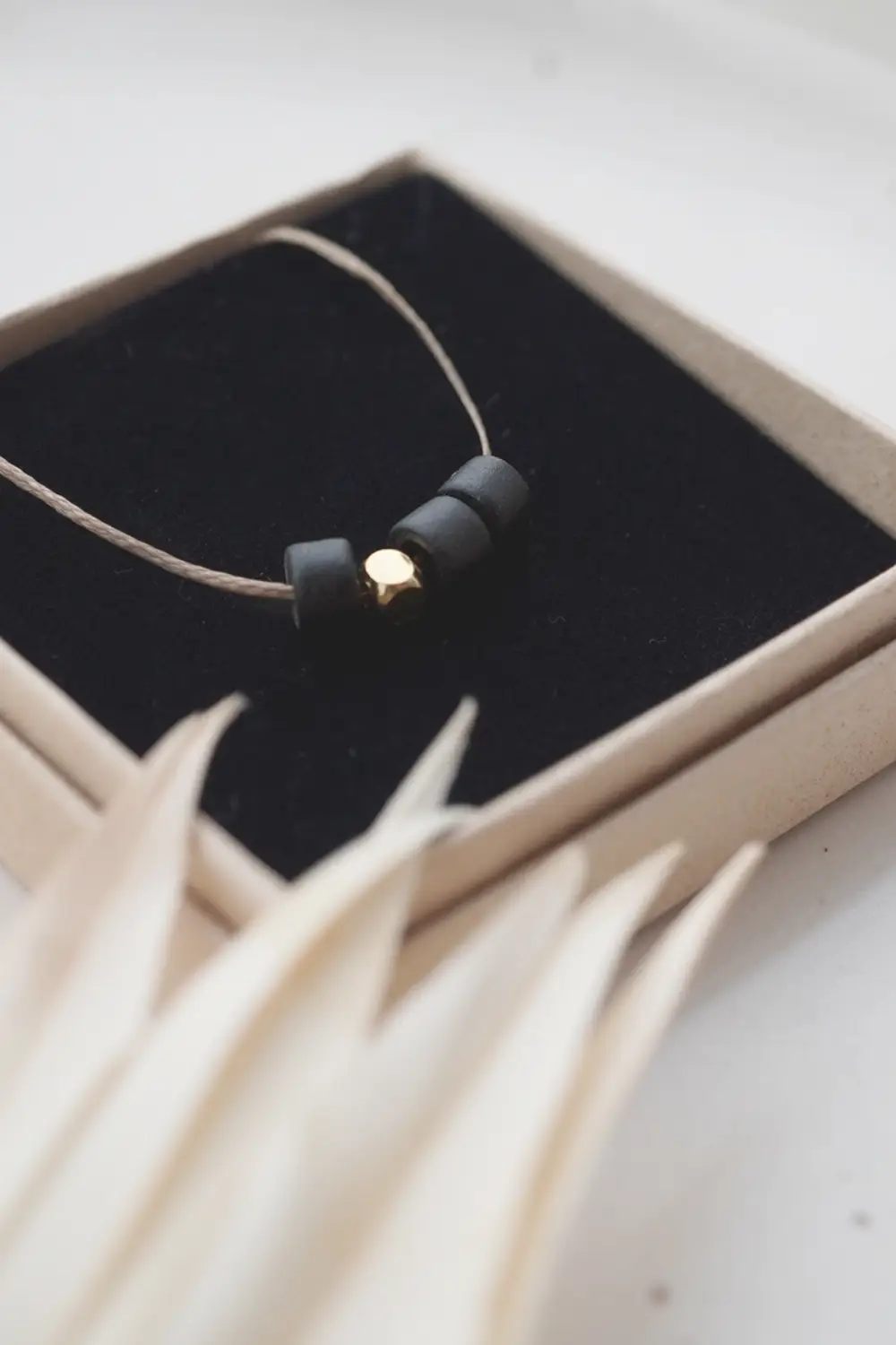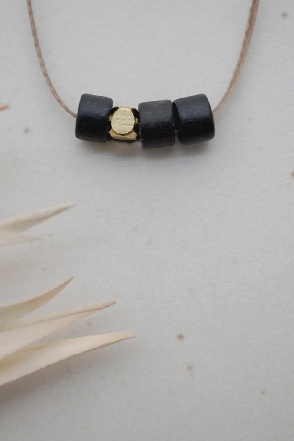 Latão fino combinado com cerâmica mate – os colares elegantes são algo muito especial. O cordão sintético é ajustável em comprimento e pode ser maravilhosamente adaptado ao traje. Colar: cordão sintético Pingente: cerâmica, latão