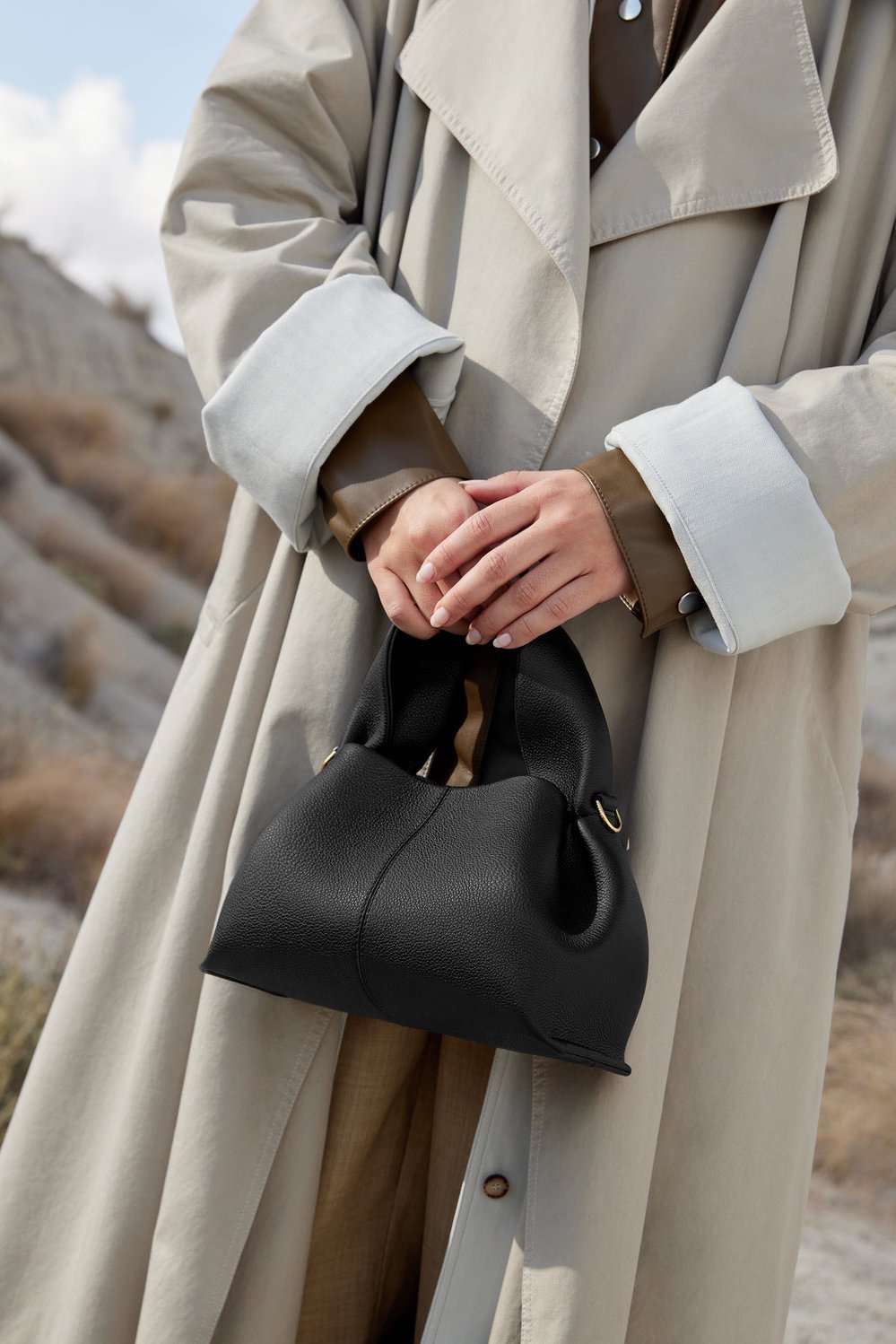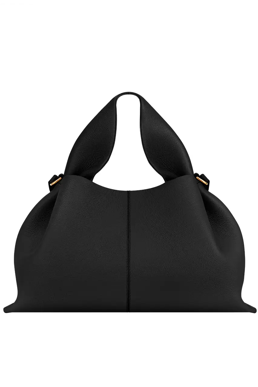 Bolsa de mão de belo acabamento que combina estrutura com fluidez. Seu design orgânico alcança o equilíbrio perfeito entre flexibilidade e sustentação, enquanto o couro drapeado é cuidadosamente fixado com costura manual — um testemunho do verdadeiro trabalho artesanal.