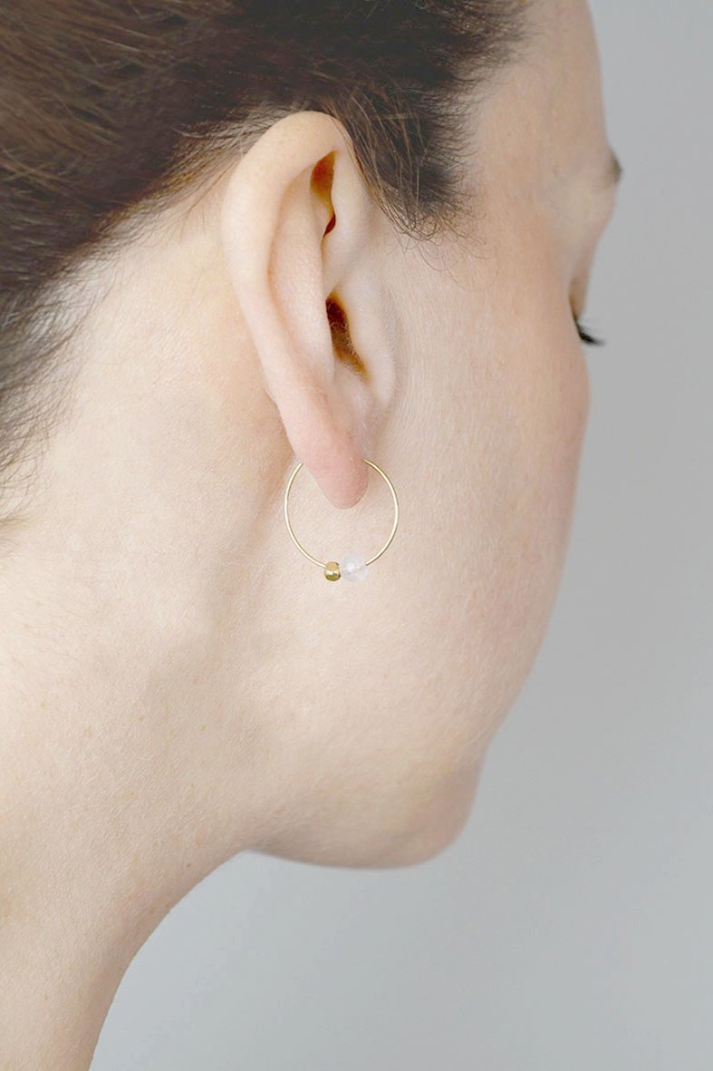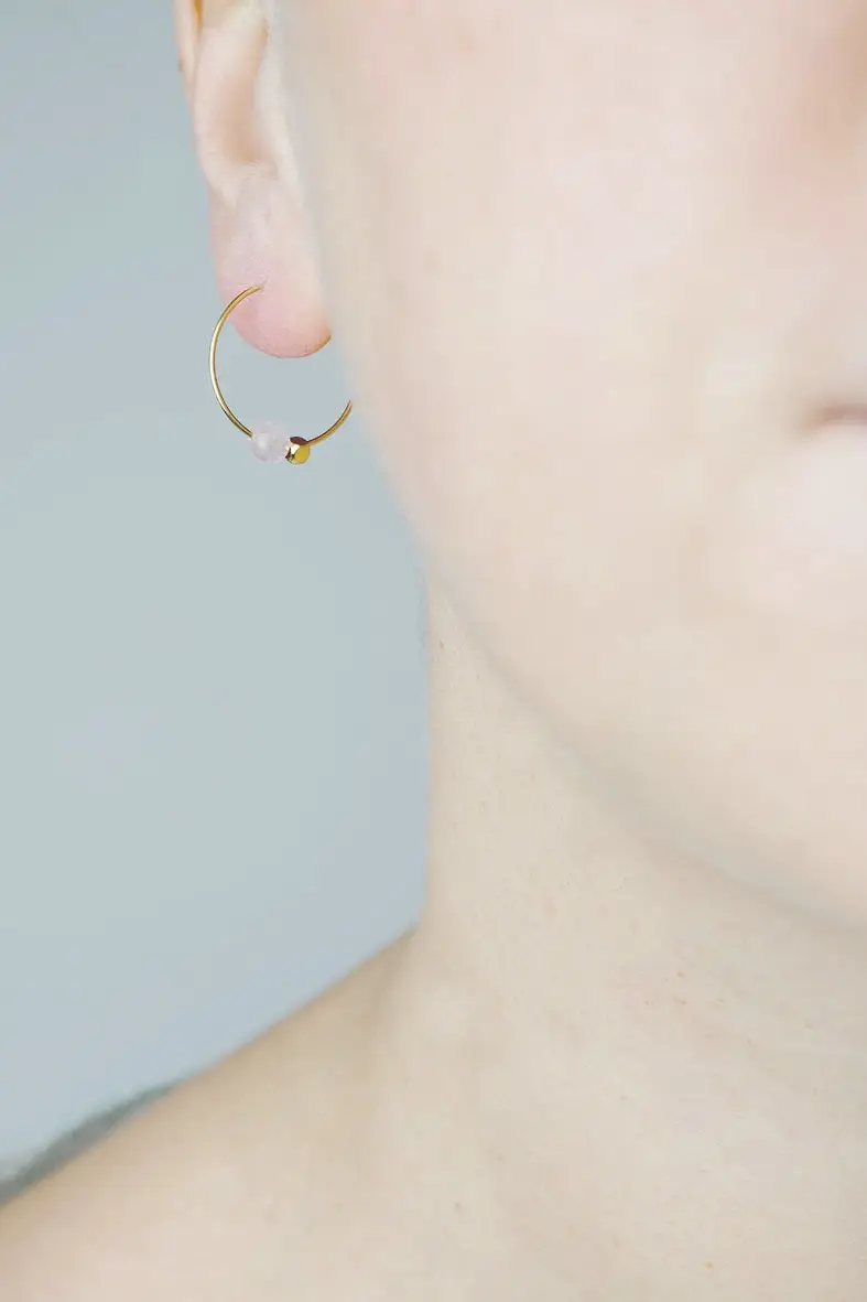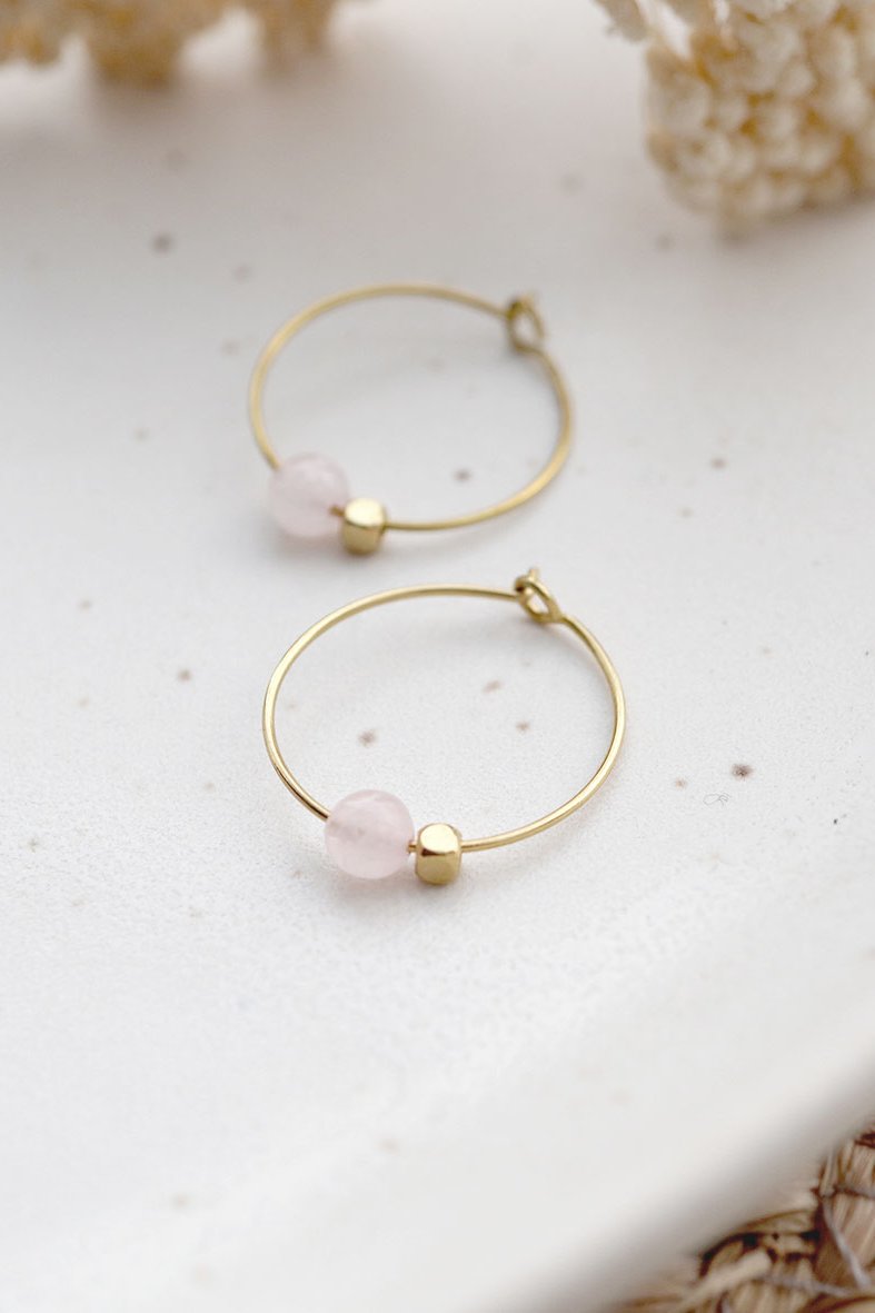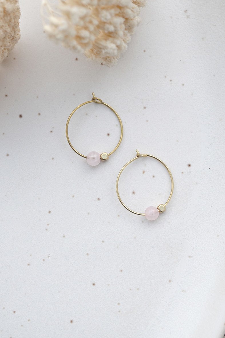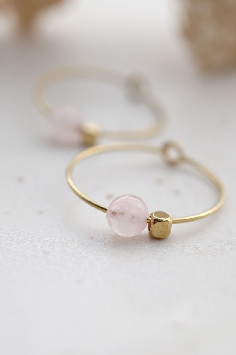 Um elegante e delicada peça de joalharia para muitas ocasiões. A bela pedra de quartzo rosa combina maravilhosamente. Pedra semipreciosa e latão, sem níquel Diâmetro da argola 2cm