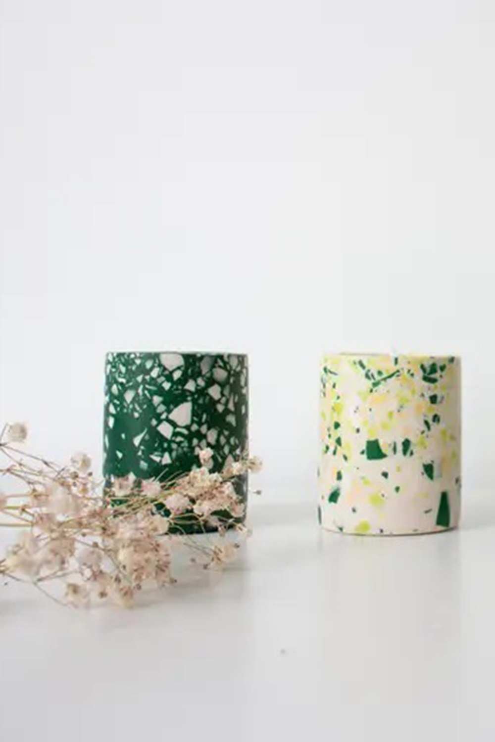 Velas de cera de soja feitas à mão na nossa,misturamos pigmentos para obter cores únicas e criamos lascas de tijoleira. É um processo que requer paciência e cuidado para obter peças de qualidade. São 100% de cera de soja, o que as torna sustentáveis pode ser usado como vaso de flores, lã de algodão ou lápis. São o toque artesanal perfeito para decorar uma casa e dar-lhe um toque de design.